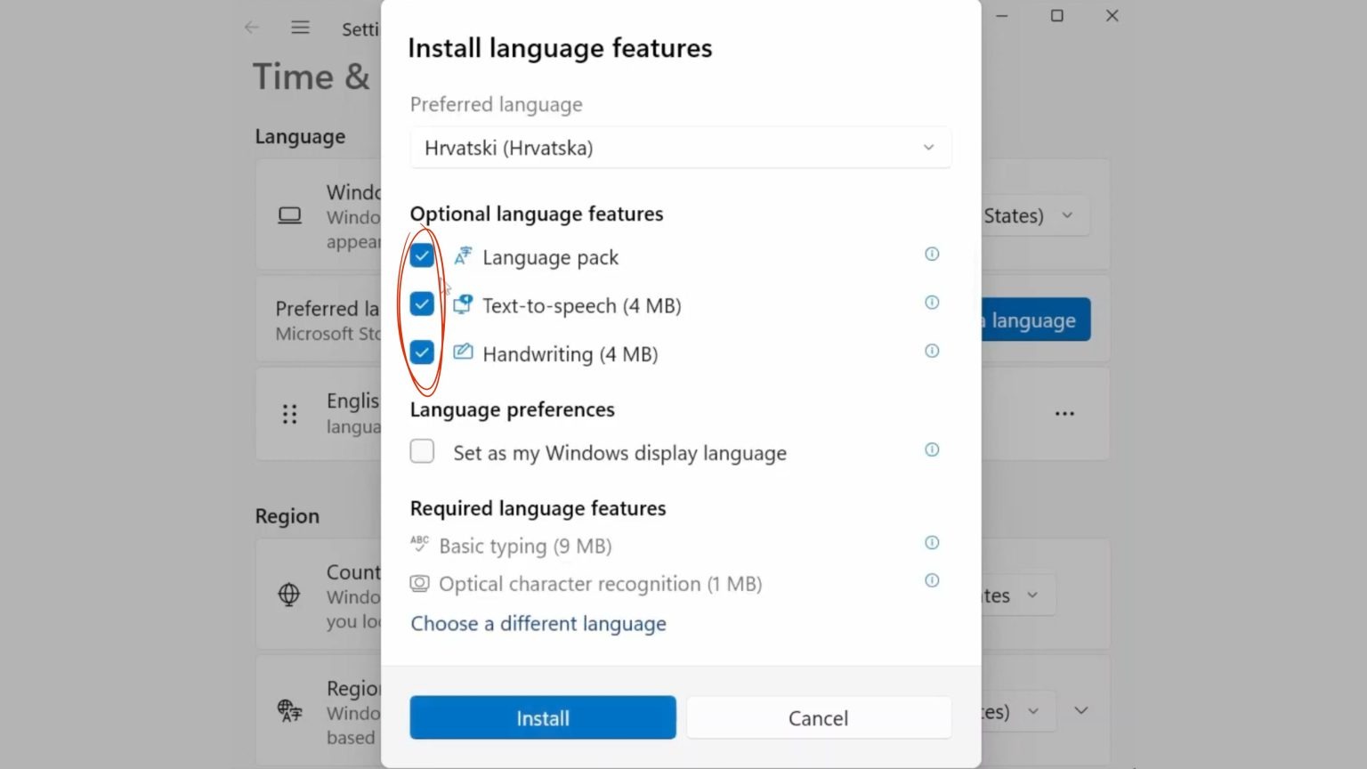 After selecting a language to add, you will have the choice of several optional language features. If you select Language Pack, you can change the menus and system language of Windows into Croatian. Additionally, Windows supports handwriting recognition.